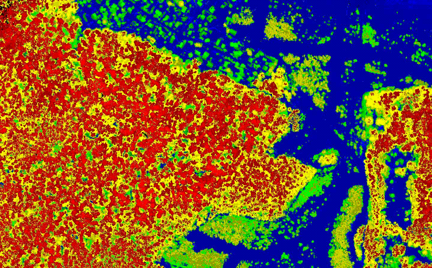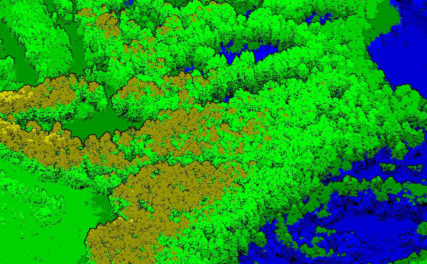 Лидар формирует плотное фактическое облако точек даже в условиях густой залесенности и таким образом позволяет четко передать фактический рельеф местности. На основе высокоточных данных, полученных с лазерного сканера и аэрофотосъемочной камеры, формируются максимально подробные трехмерные модели.