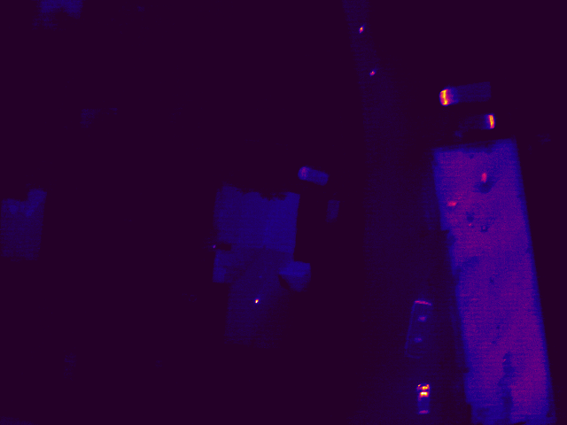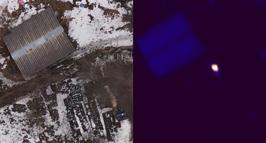 Съёмка с применением новой технологии проводится при помощи БПЛА Геоскан 201 . В качестве полезной нагрузки установлены тепловизор диапазона 8-14 мкм (длинноволновый ИК диапазон) и фотокамера для одновременного ведения аэрофотосъемки в видимом диапазоне. Получаемые инфракрасные изображения в оттенках серого могут быть преобразованы в псевдоцветные, где темным оттенкам соответствуют низкие температуры, а светлым – высокие: