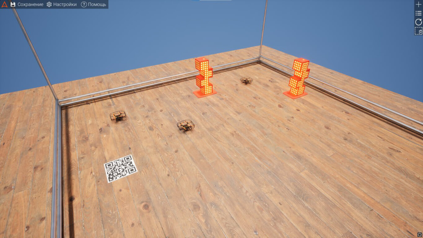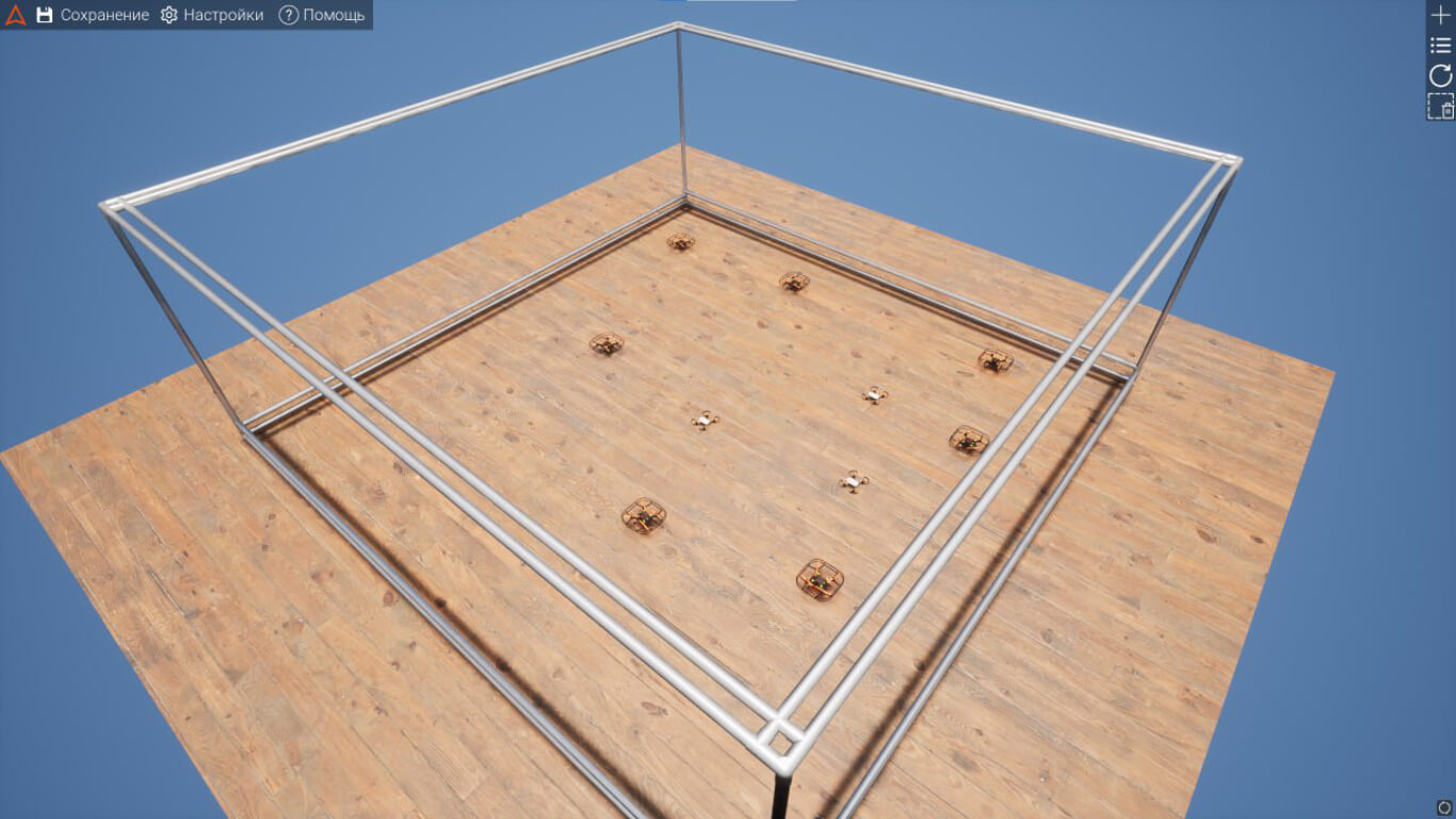 - Песочница (легкий) — ограничения реального полета не учитываются: квадрокоптеры выполняют команды с максимальной точностью и без задержек.